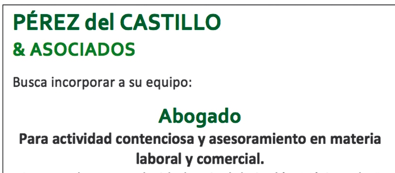 1.Abogado: para actividad contenciosa y asesoramiento en materia laboral y comercial. Con excelente escolaridad y nivel de inglés. Mínimo de 5 años de experiencia profesional. Capacidad de trabajo en equipo y actitud emprendedora.